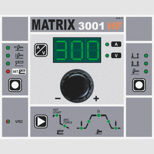 MATRIX 3001 HF je visoko zmogljiv, grajen na osnovi inverterske tehnologije IGBT. Opremljen je s preprostim, uporabniku prijaznim digitalnim zaslonom, ki omogoča (pred)nastavitev vseh varilnih parametrov, enostavno prilagajanje osnovnih varilnih funkcij in zadrži zadnje prebrane vrednosti.